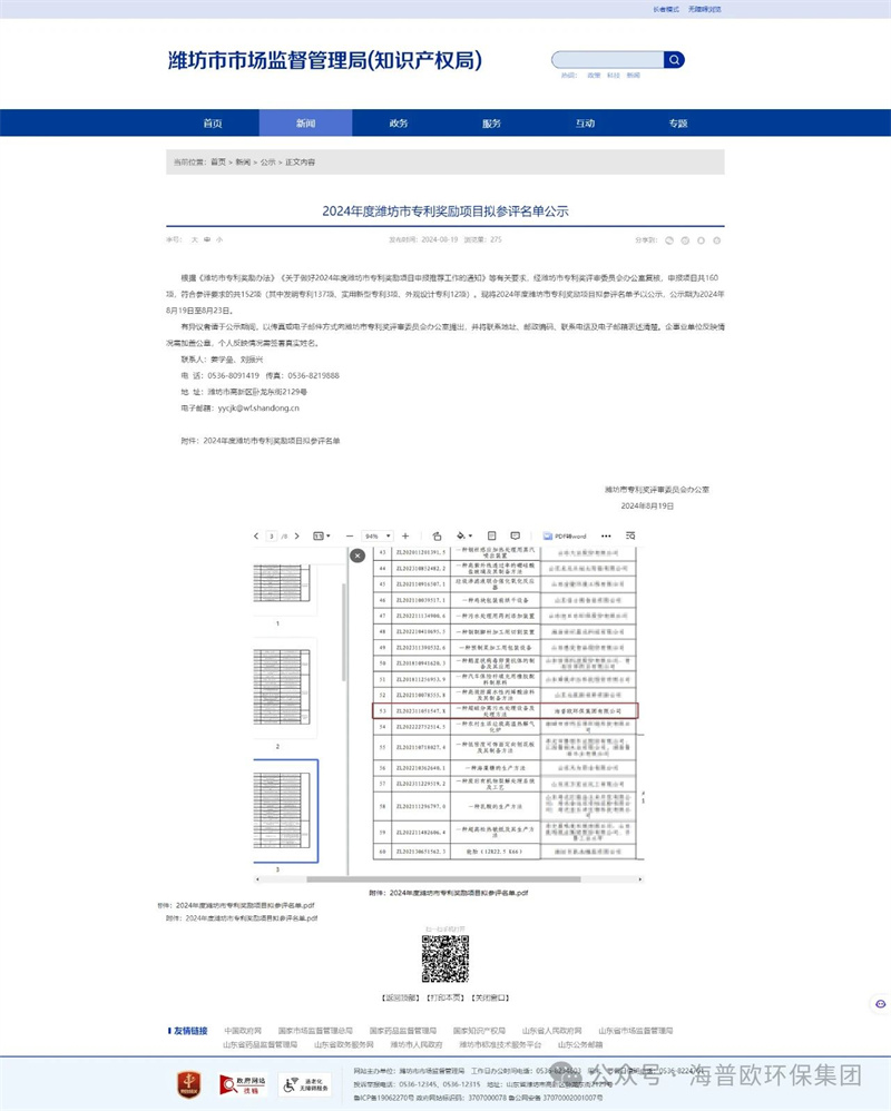今日,濰坊市市場監(jian)督(du)管(guan)理局(知識(shi)產權(quan)局)一(yi)則振奮(fen)人心的(de)喜(xi)訊(xun)傳來!海(hai)普歐環保集團的(de) “一(yi)種超磁分離污(wu)水處理設備及處理方法” 專(zhuan)利(li)成功獲得 2024 年(nian)度(du)濰坊市專(zhuan)利(li)獎勵。